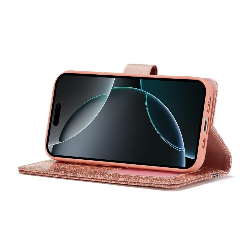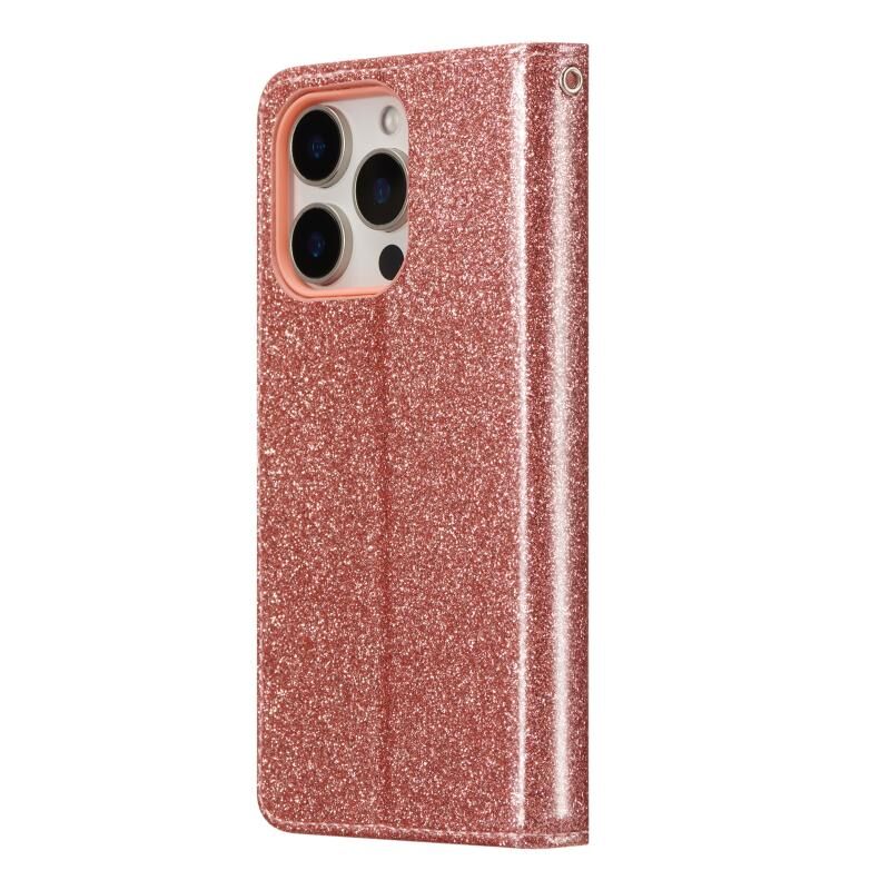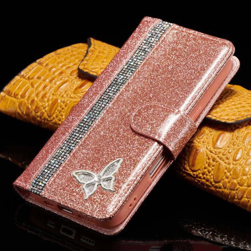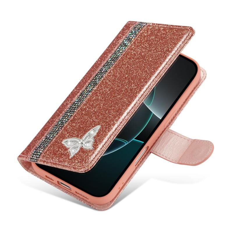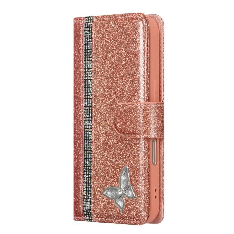 Θήκη τηλεφώνου από δέρμα με γκλίτερ και πεταλούδες για iPhone 16 Pro Max (Ροζ Χρυσό)