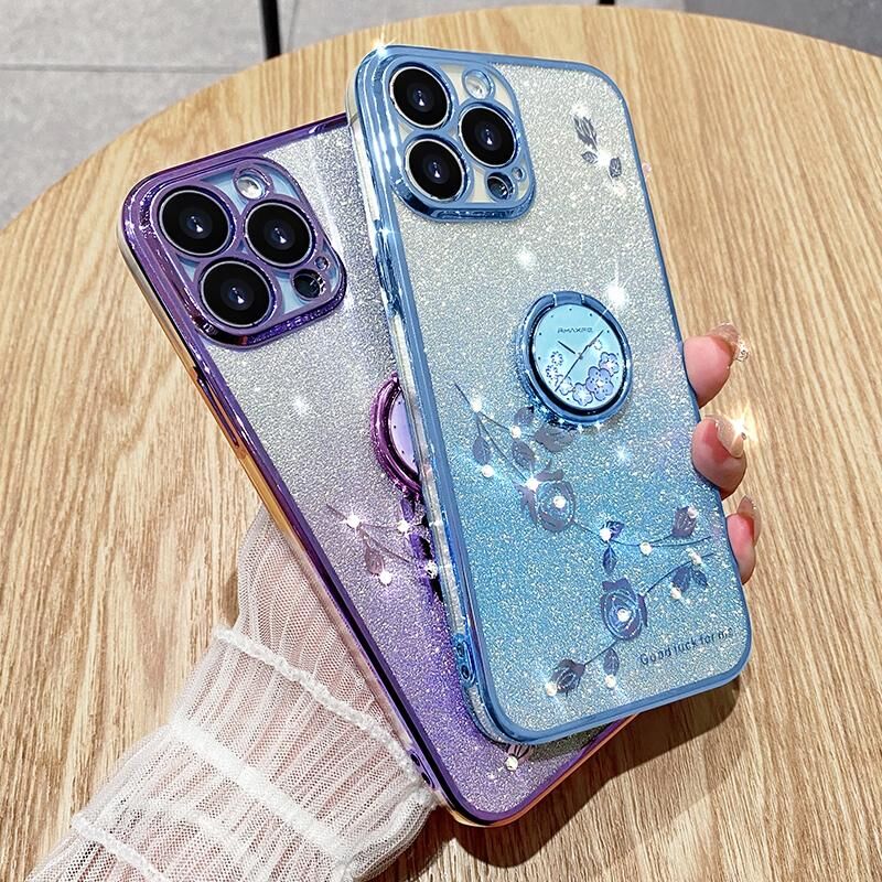 Θήκη κινητού τηλεφώνου για iPhone 16 Pro Max με διαβαθμισμένη λάμψη, αθάνατο λουλούδι και δακτύλιο, πλήρως προστατευτική (Μπλε)