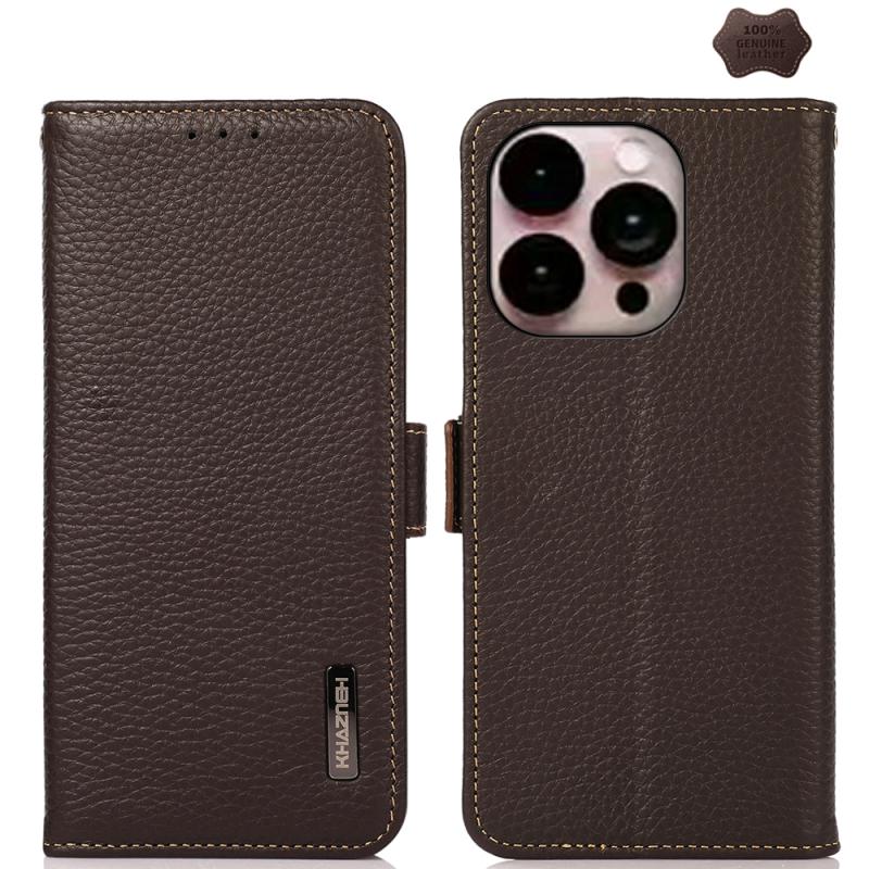 For iPhone 16 Pro Max KHAZNEH Side-Magnetic Litchi Genuine Leather RFID Case(Brown)