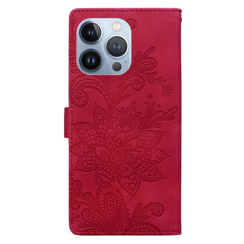 Θήκη κινητού τηλεφώνου για iPhone 16 Pro Max με δερμάτινη βάση PU, μαγνητικό κούμπωμα και ανάγλυφο σχέδιο δαντέλας με λουλούδια, με λουρί καρπού (Πράσινο)