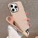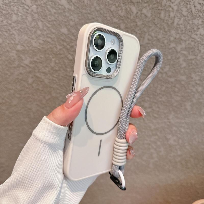 For iPhone 16 Pro Max Metal Diamond Texture Lens Frame MagSafe Phone Case with Lanyard(Khaki)