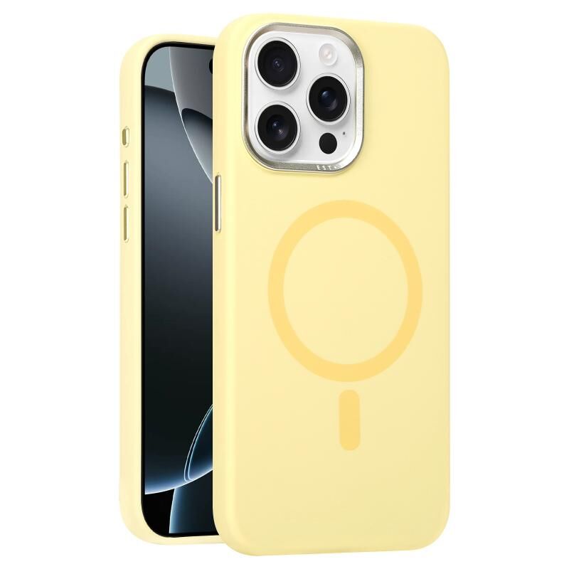 For iPhone 16 Pro Max Metal Lens Frame Liquid Silicone MagSafe Phone Case(Cream Yellow)