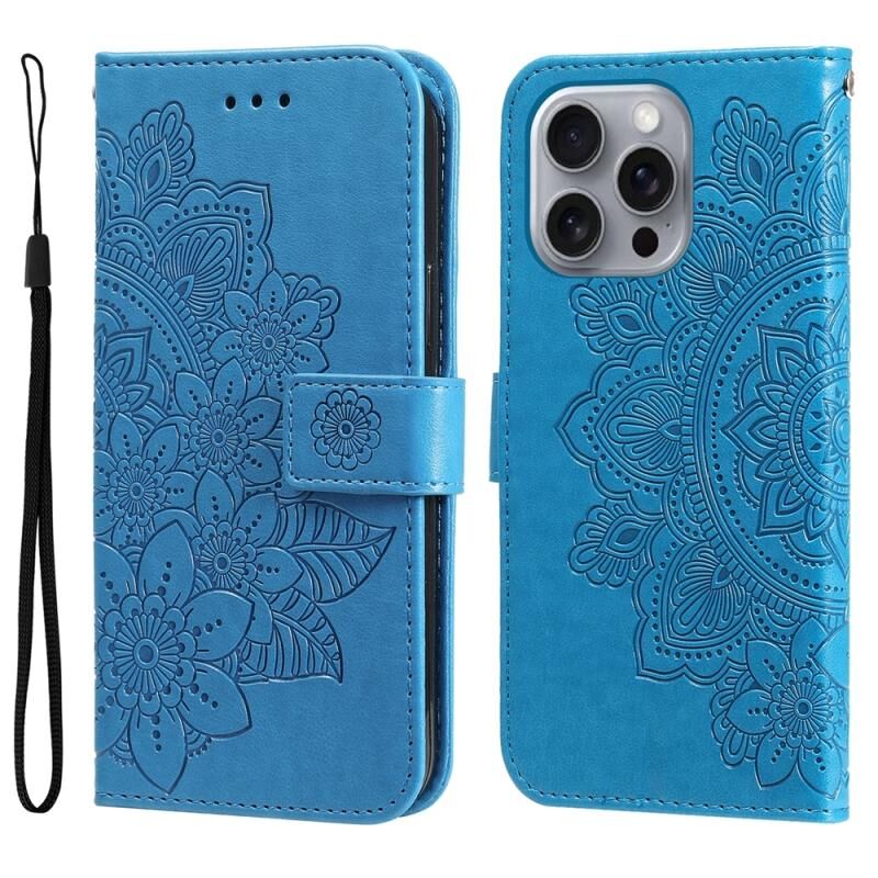 Θήκη τηλεφώνου από δέρμα με ανάγλυφα επτά πέταλα για iPhone 16 Pro Max (Μπλε)