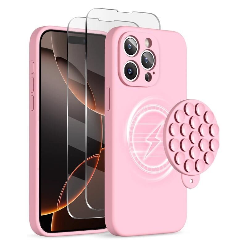 Θήκη τηλεφώνου MagSafe από σιλικόνη με βεντούζα για iPhone 16 Pro Max με προστατευτική μεμβράνη οθόνης (Ροζ)
