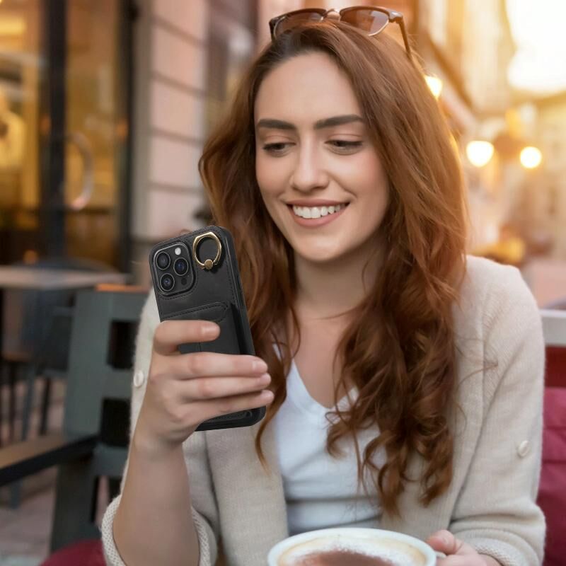 Θήκη τηλεφώνου για iPhone 16 Pro Max με αίσθηση δέρματος και θήκη καρτών με αγκράφα δακτυλιδιού (Μαύρο)