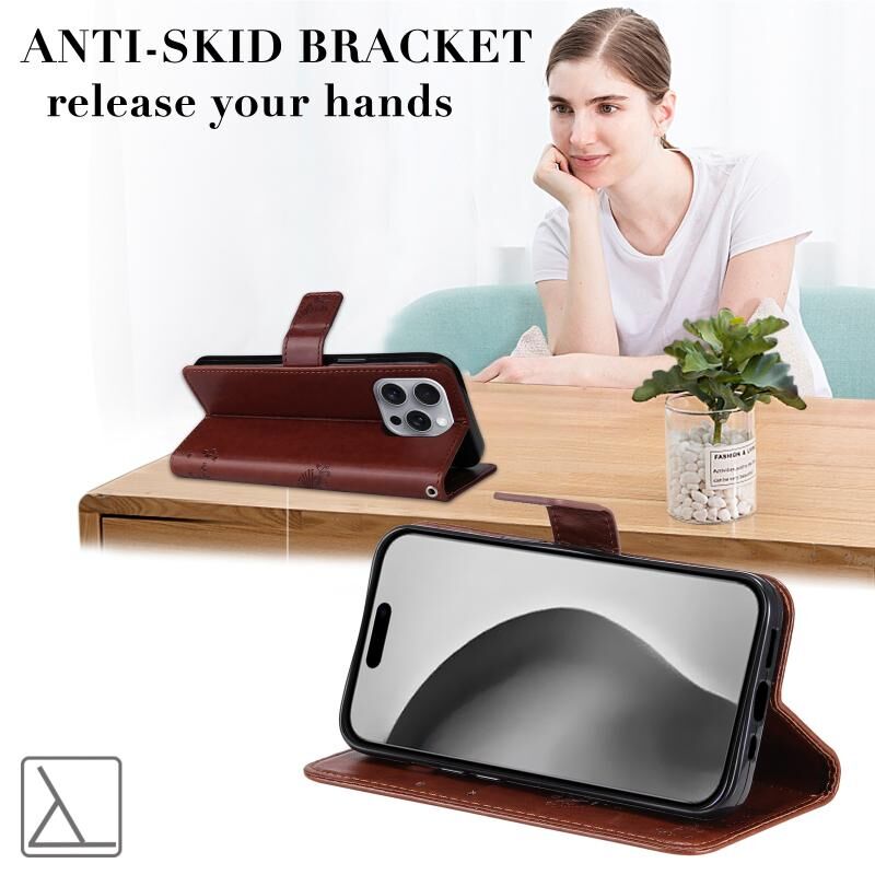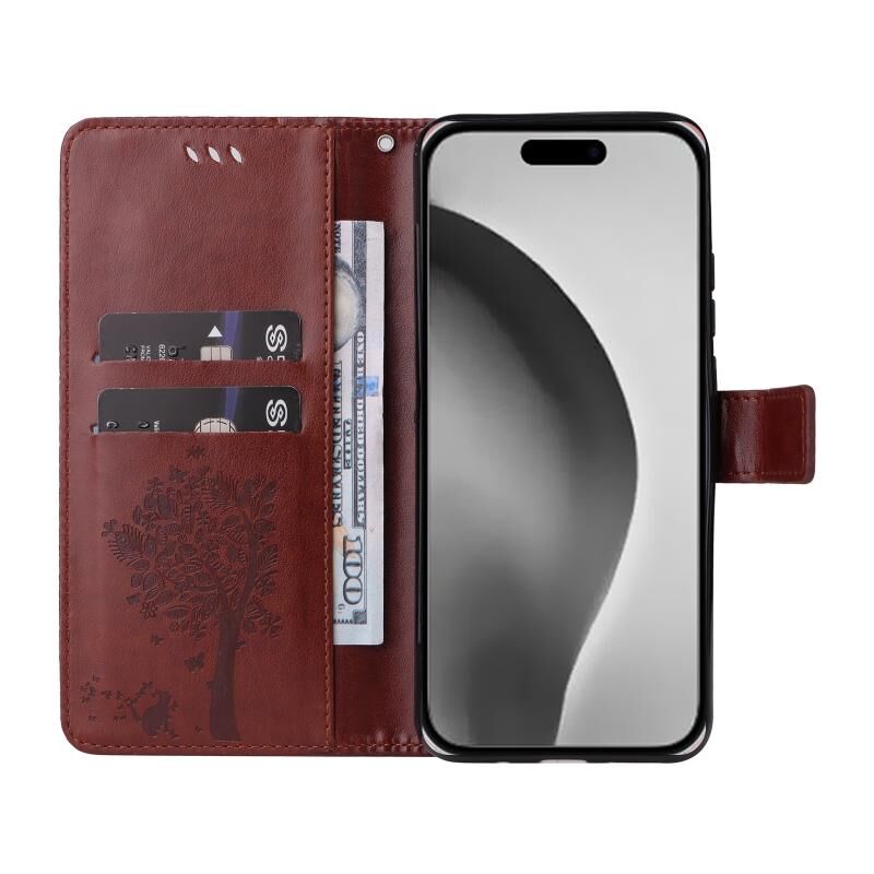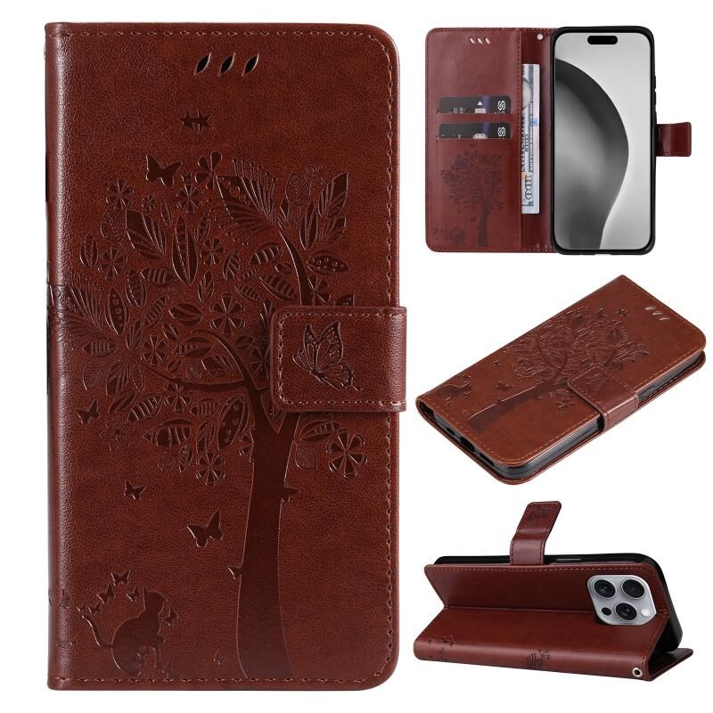Θήκη τηλεφώνου από δέρμα με σχέδιο ανάγλυφου δέντρου & γάτας, τύπου flip, για iPhone 16 Pro Max (Καφέ)