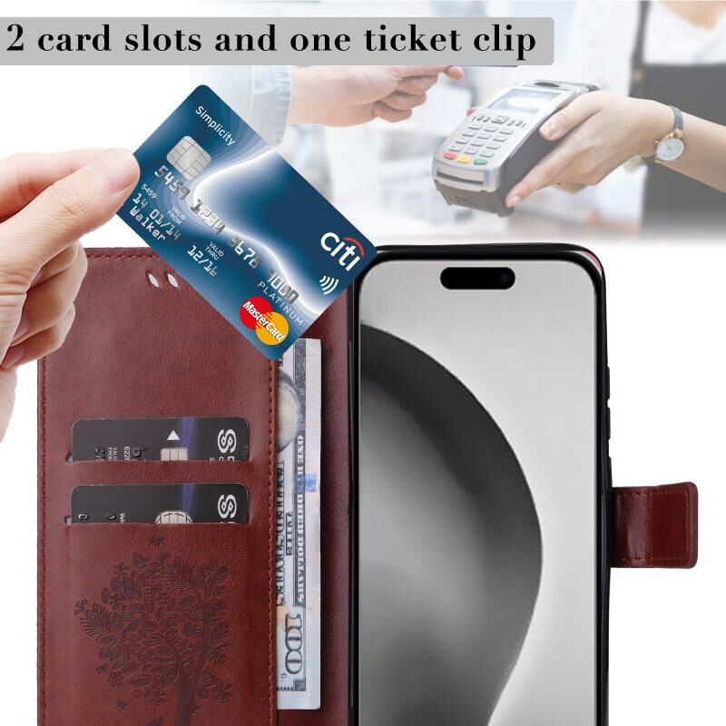 4. Λειτουργία Πορτοφολιού: Η δερμάτινη θήκη είναι εξοπλισμένη με υποδοχές καρτών για την τοποθέτηση καρτών και ενός μικρού ποσού μετρητών.
