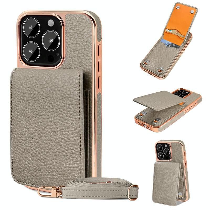 Θήκη κινητού τηλεφώνου VIETAO με υφή δέρματος λύτσι και θήκη πορτοφολιού με κορδόνι για iPhone 16 Pro Max (Ροζ) (Γκρι)