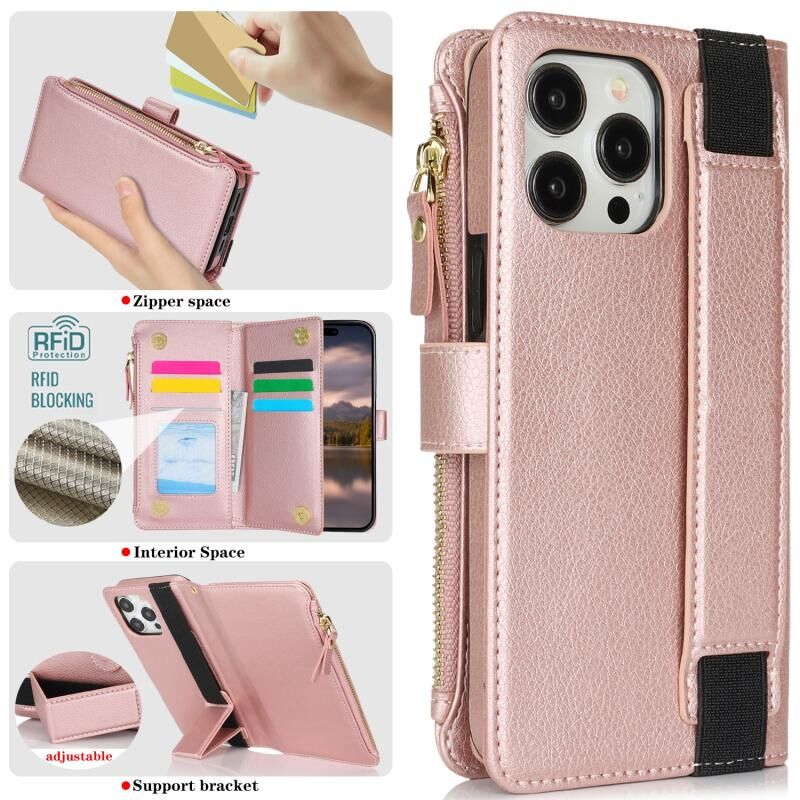 Θήκη για iPhone 16 Pro Max με Λουρί Χειρός, Πορτοφόλι με Φερμουάρ, Δέρμα με Προστασία RFID (Καφέ)