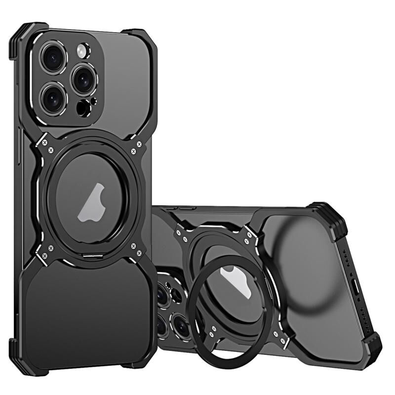 For iPhone 16 Pro Mechanical Arm Borderless MagSafe Holder Metal Phone Case(Black Silver)