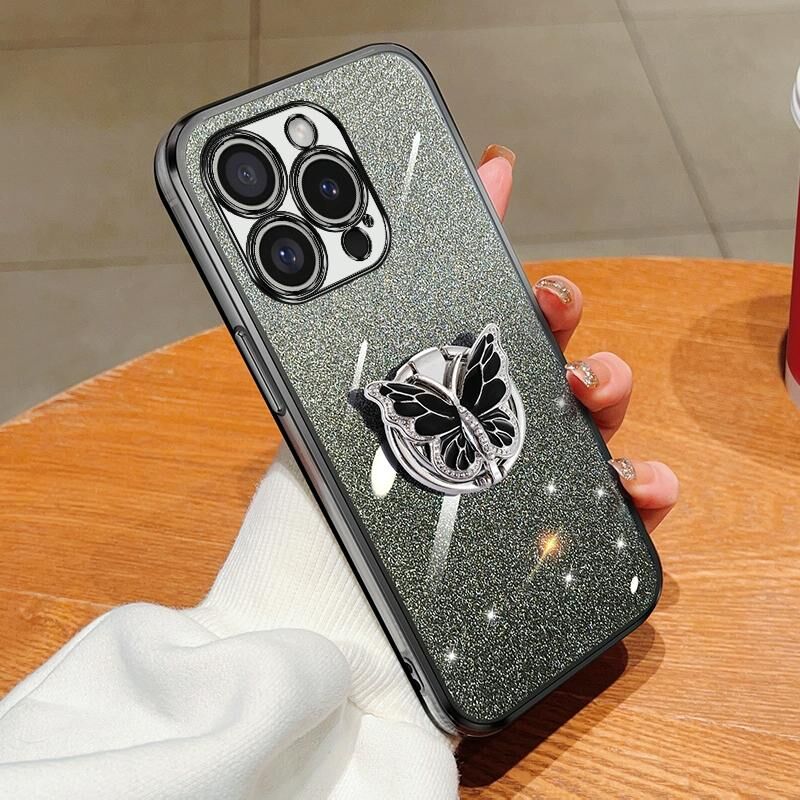 Θήκη τηλεφώνου TPU με επιμετάλλωση, διαβαθμισμένη λάμψη και σχέδιο πεταλούδας για iPhone 16 Pro (Μαύρο)