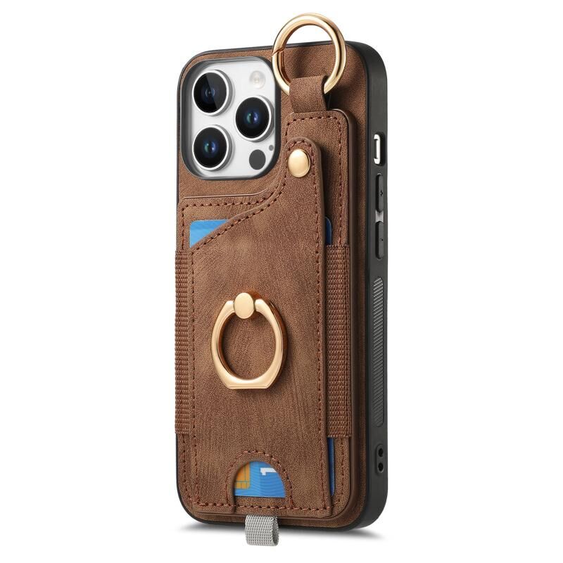 Για το iPhone 16 Pro Ρετρό δέρμα αίσθηση δαχτυλίδι κάρτα τσάντα υπόθεση τηλεφώνου με κρεμάσει βρόχο (καφέ)