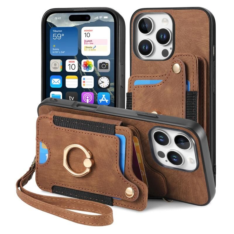 Θήκη τηλεφώνου για iPhone 16 Pro με ρετρό υφή, δακτύλιο και πολλαπλές θήκες καρτών (Ροζ)