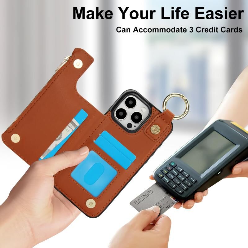 For iPhone 16 Pro RFlD Anti-theft Double Buckle Ring Zipper Card Phone Case(Brown)