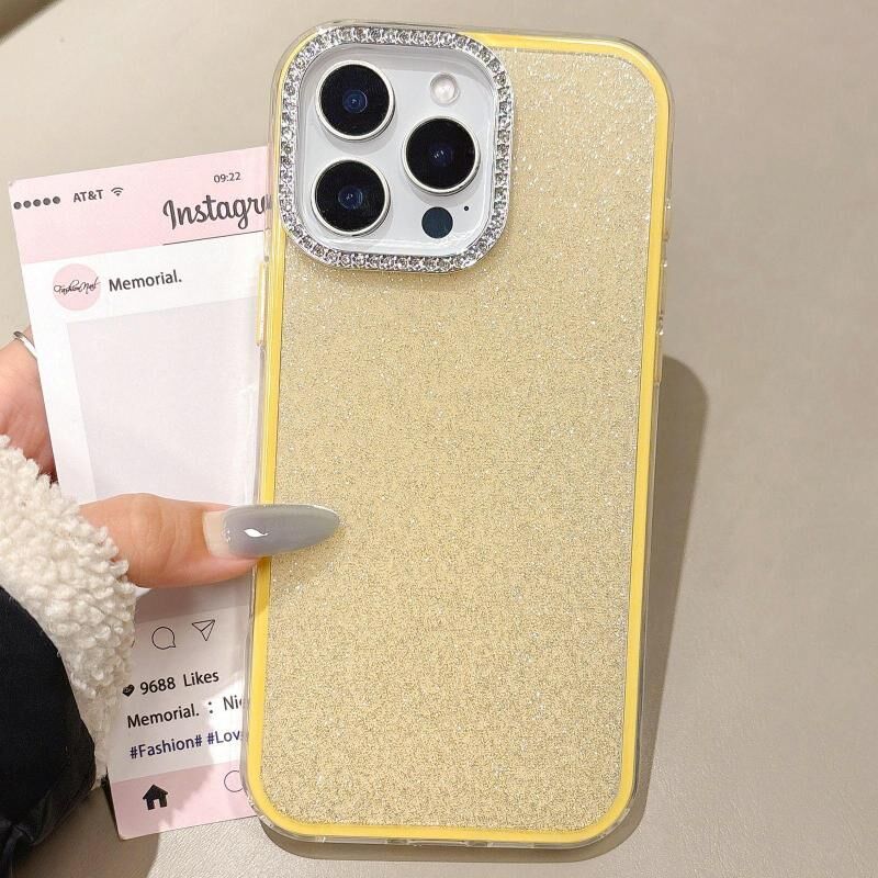 For iPhone 16 Pro Rhinestone-Embedded Camera Frame Glitter Full Coverage Phone Case(Yellow)