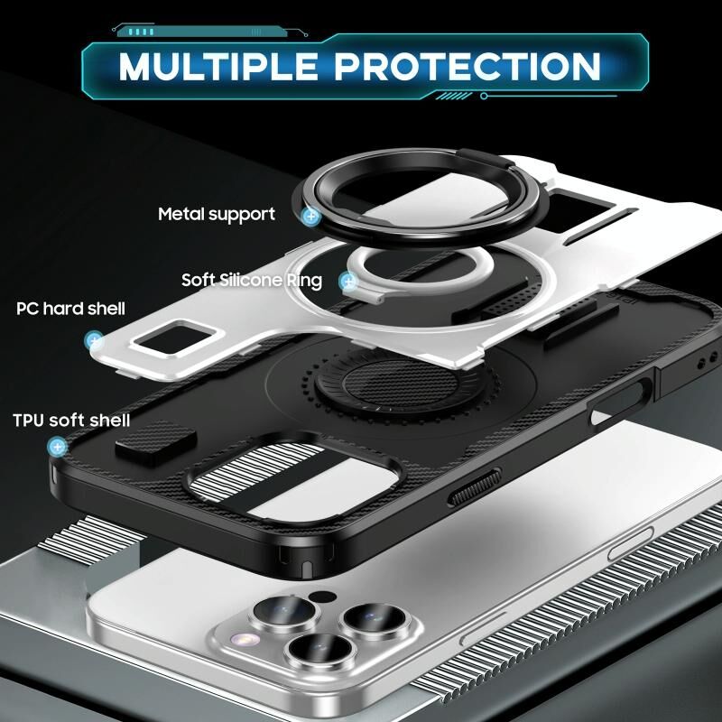 3. Δακτύλιος Σιλικόνης και Βάση: Δεν παρέχει μόνο βασική προστασία, αλλά η θήκη λειτουργεί και ως λαβή για να κρατάτε σταθερά το τηλέφωνό σας. Και ως βάση τηλεφώνου που επιτρέπει την κατακόρυφη ή οριζόντια λειτουργία σε πολλαπλές γωνίες.