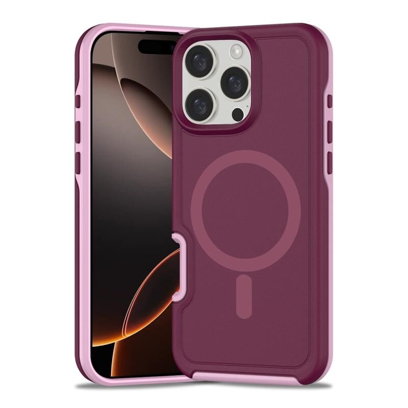 For iPhone 16 Pro Shockproof MagSafe Armor PC Hybrid TPU Phone Case(Wine Red+Light Pink)