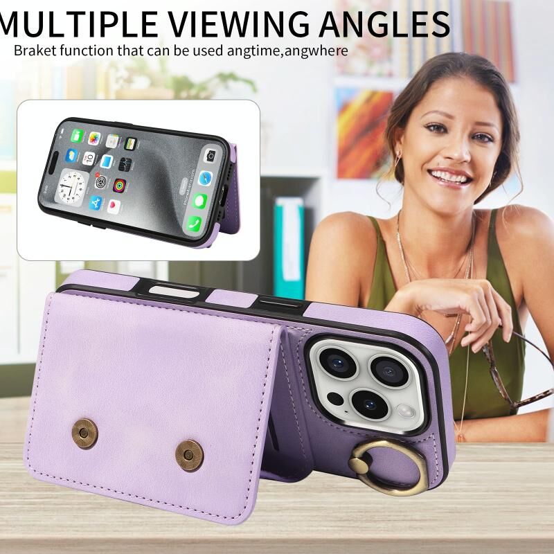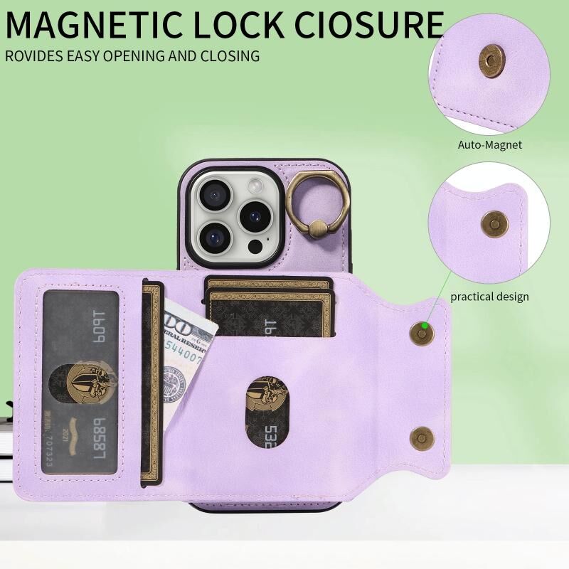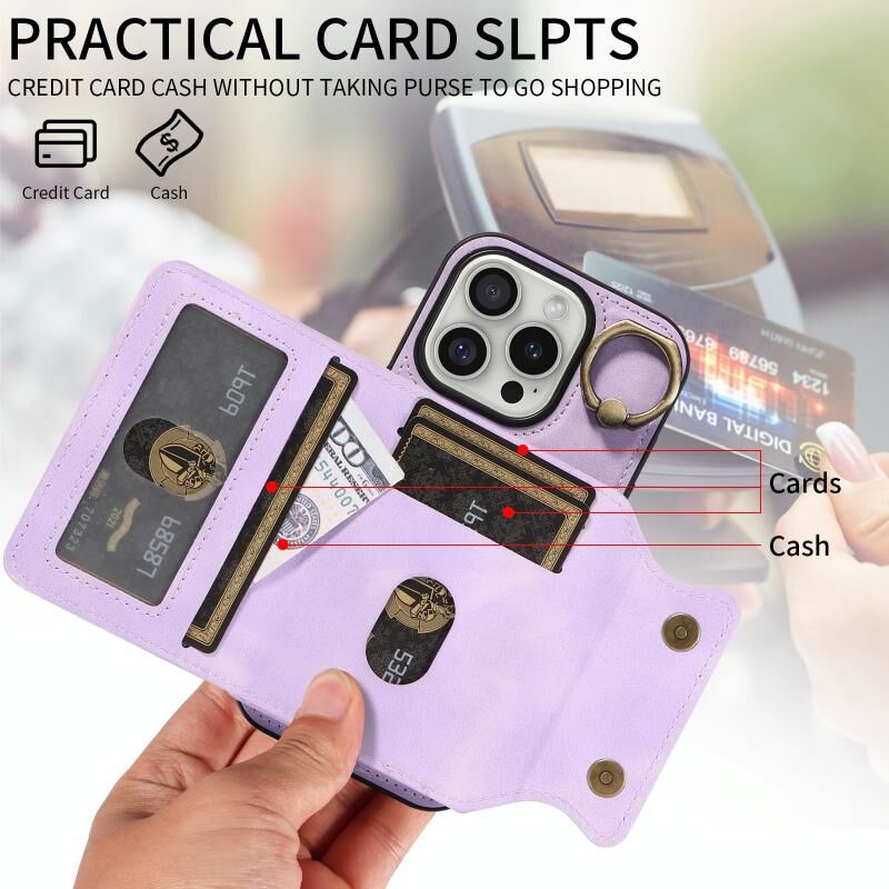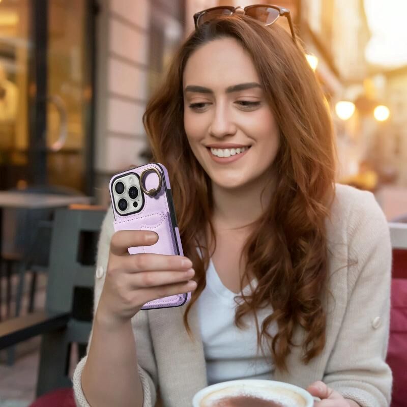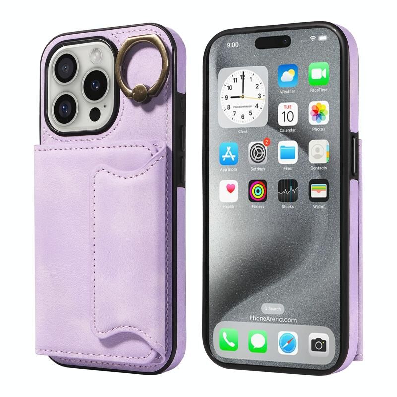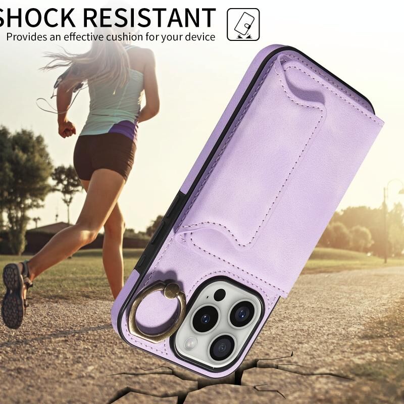 Θήκη τηλεφώνου για iPhone 16 Pro με αίσθηση δέρματος και θήκη καρτών με αγκράφα δακτυλιδιού (Χρυσό ροζ)