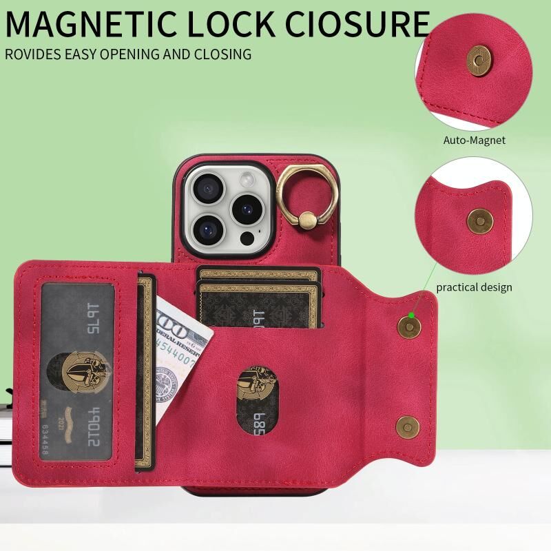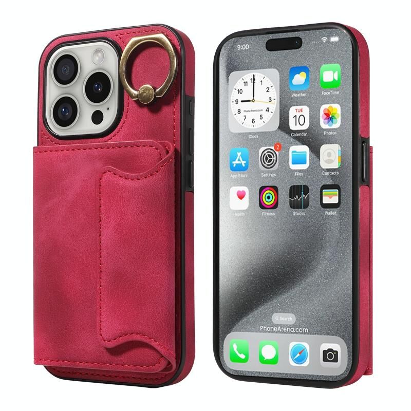 Θήκη τηλεφώνου για iPhone 16 Pro με αίσθηση δέρματος και θήκη καρτών με αγκράφα δακτυλιδιού (Κόκκινο)