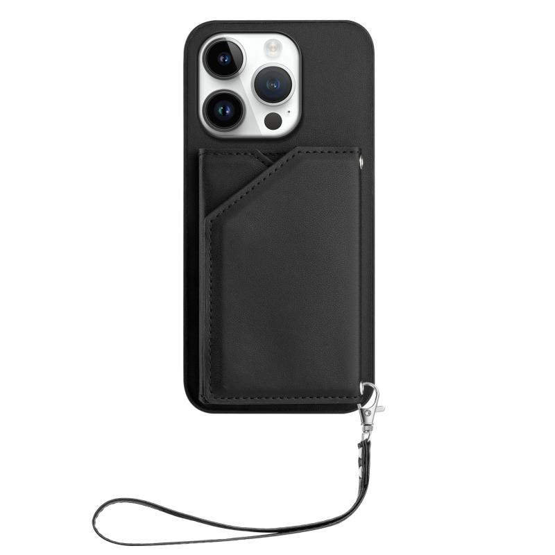 For iPhone 16 Pro Skin Feel Four Card Slots Phone Case with Wrist Strap(Black)