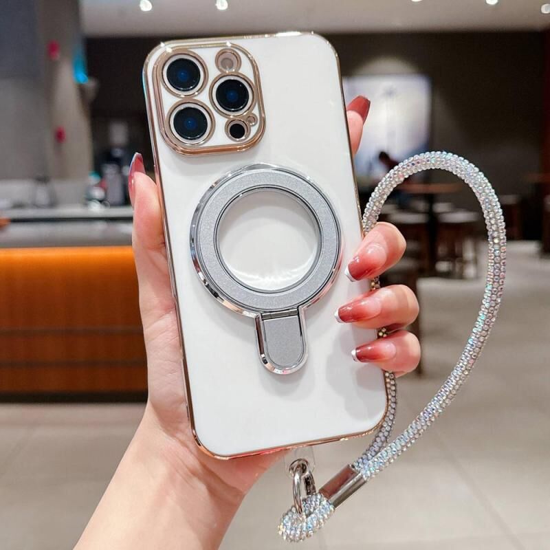 For iPhone 16 Pro Solid Color Electroplated Metal Holder Phone Case with Lanyard(Silver White)