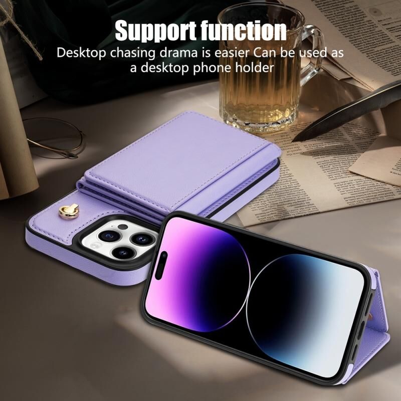 For iPhone 16 Pro Three Fold Card Bag Phone Case with Long Lanyard(Purple)