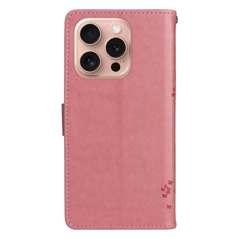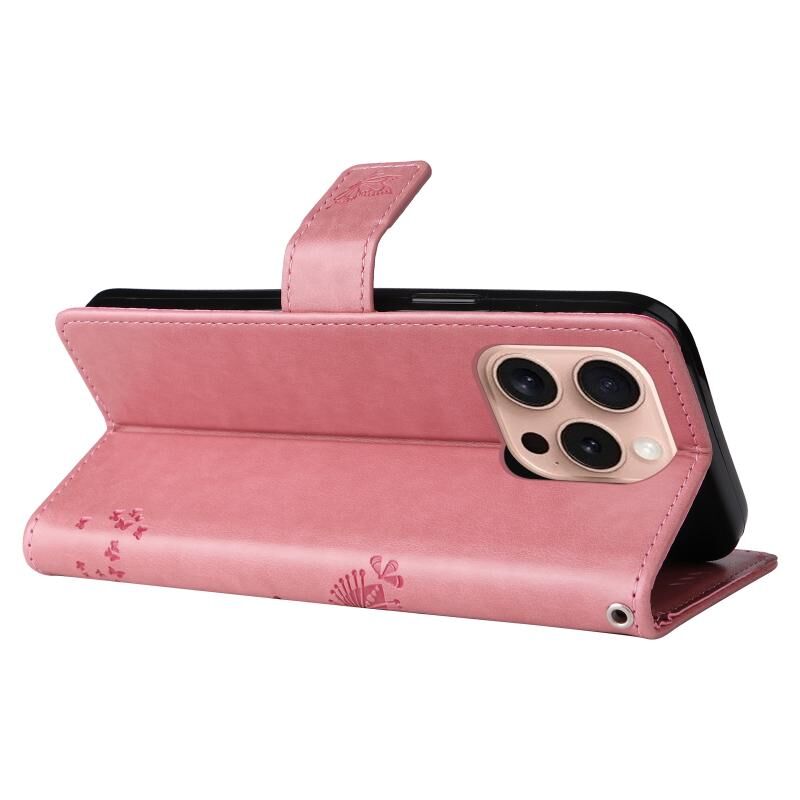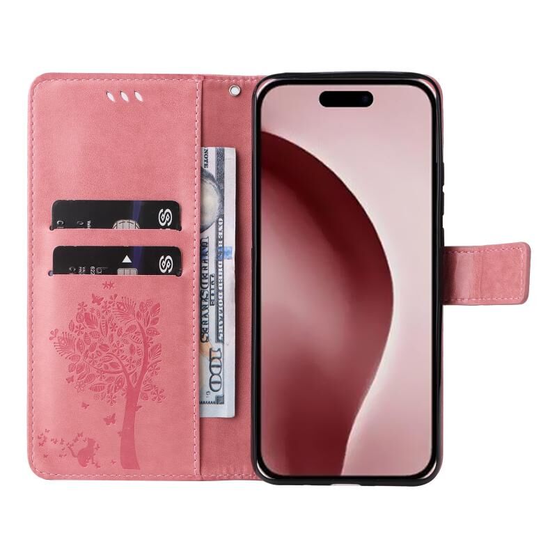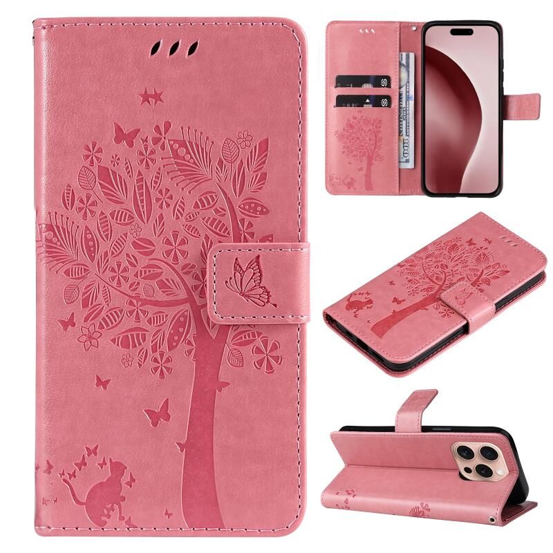 For iPhone 16 Pro Tree & Cat Embossed Pattern Flip Leather Phone Case(Pink)