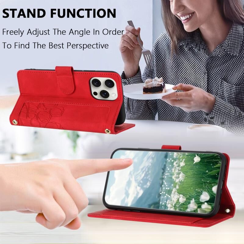 For iPhone 16 Pro Tulips Embossed Leather Phone Case with Lanyard(Red)