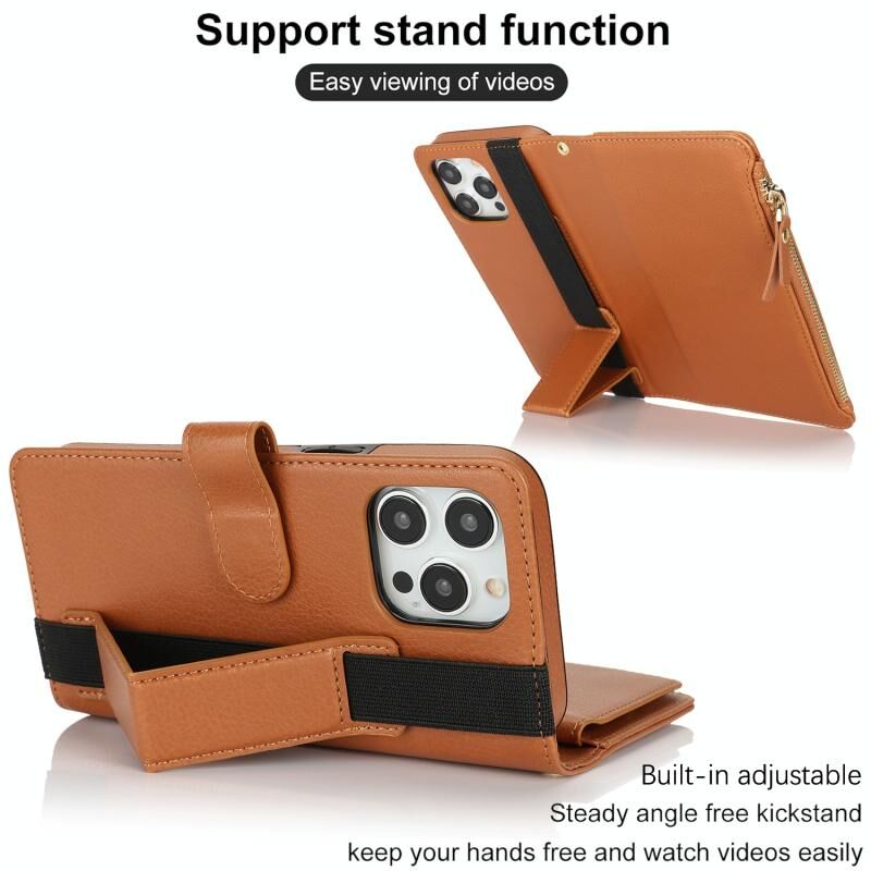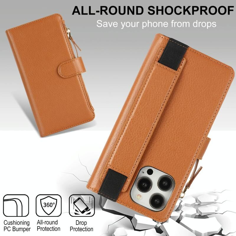 Θήκη για iPhone 16 Pro με Λουρί Χεριού, Πορτοφόλι με Φερμουάρ, Δέρμα με Προστασία RFID (Καφέ)