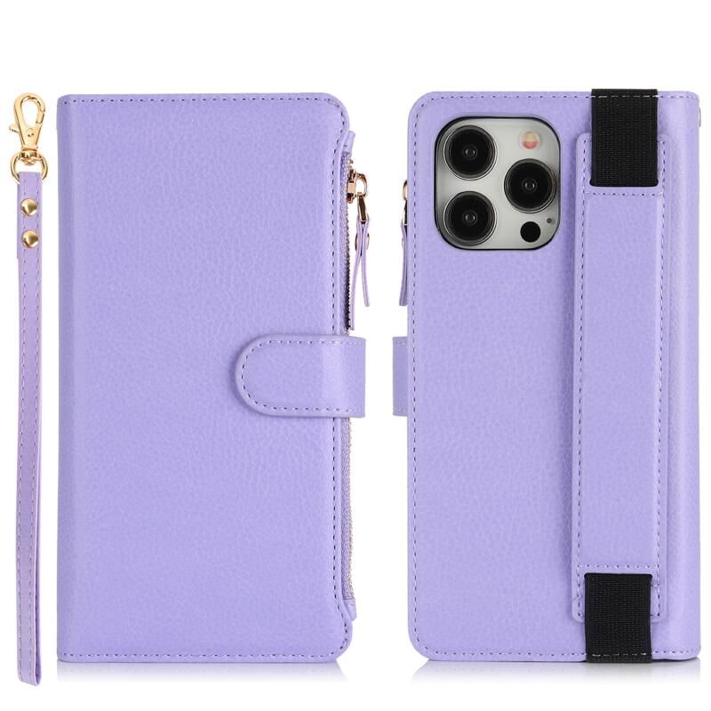 Θήκη για iPhone 16 Pro με Λουρί Χειρός, Πορτοφόλι με Φερμουάρ, Δέρμα με Προστασία RFID (Μωβ)