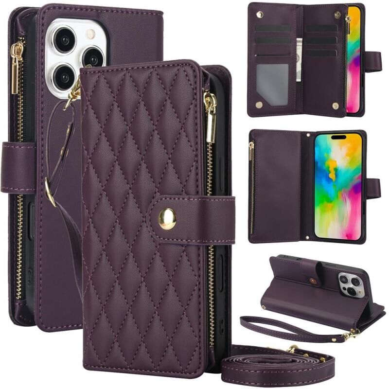 For iPhone 16 Pro YM016 Rhombic Zipper Card Wallet Leather Phone Case with Lanyard(Dark Purple)