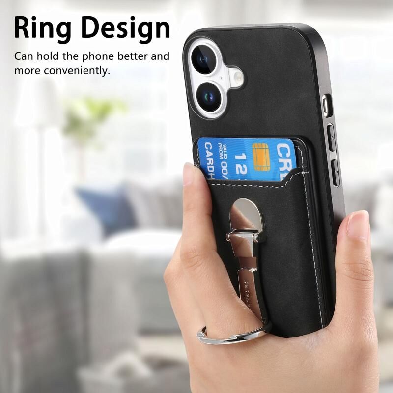 For iPhone 16 Retro Folding Ring Holder Card Bag MagSafe Phone Case(Black)