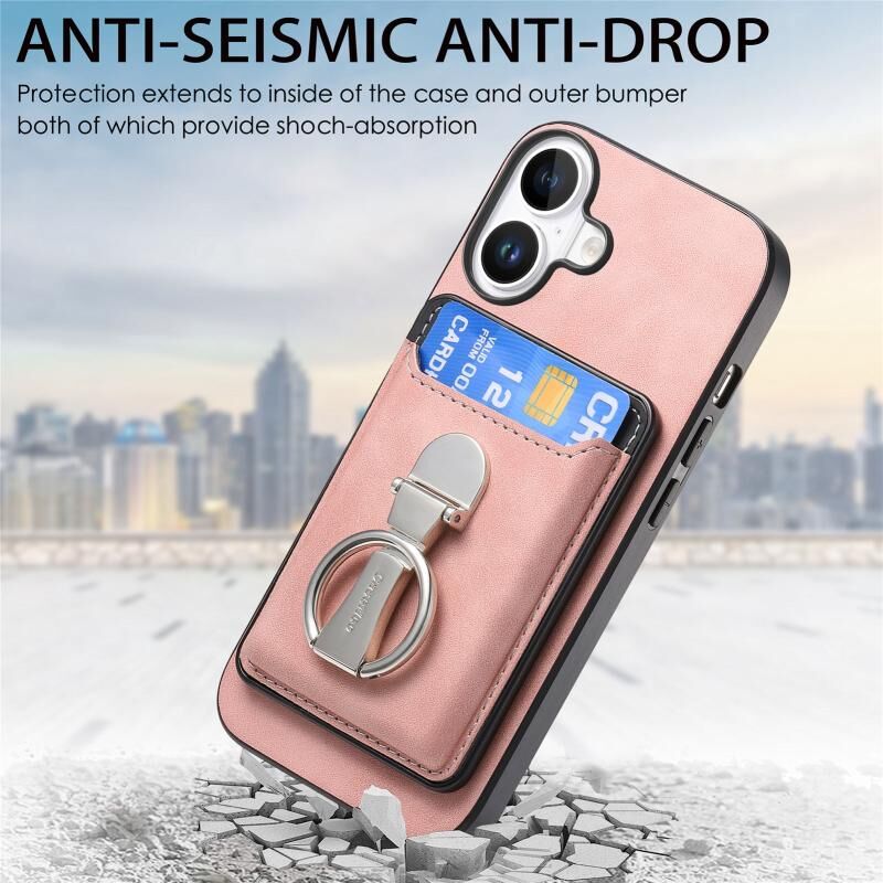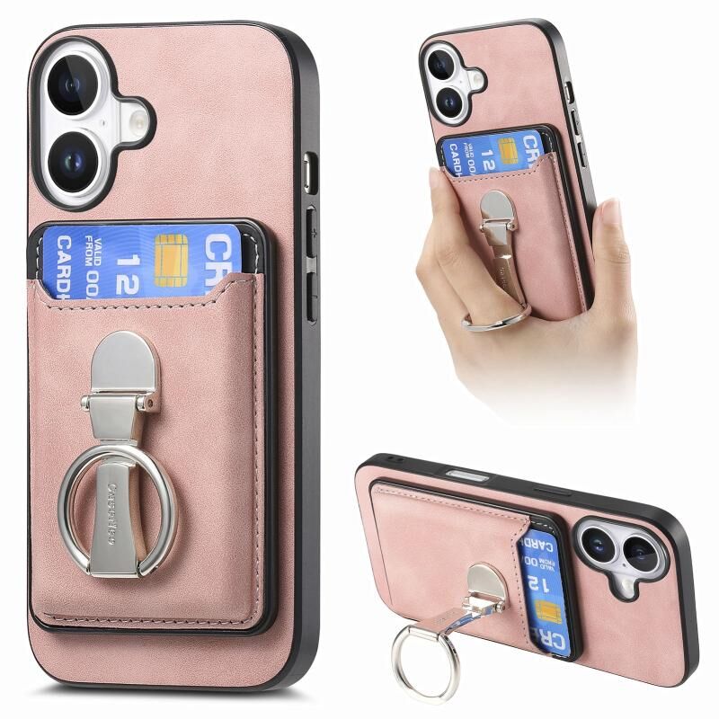 For iPhone 16 Retro Folding Ring Holder Card Bag MagSafe Phone Case(Pink)