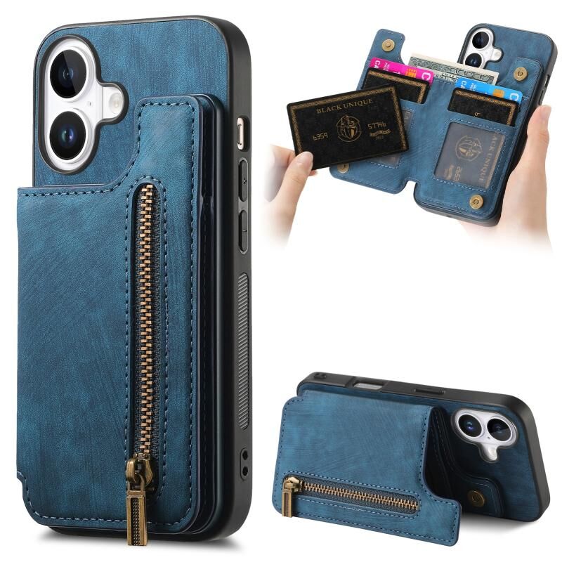 Για iPhone 16 Ρετρό δέρμα φερμουάρ πορτοφόλι πίσω υπόθεση τηλεφώνου (μπλε)