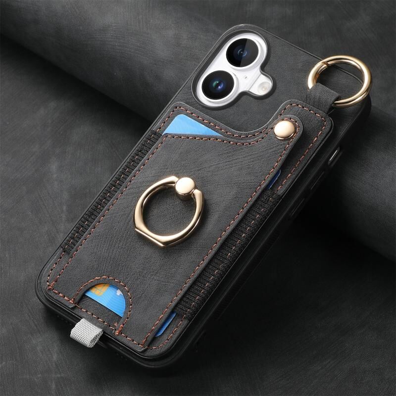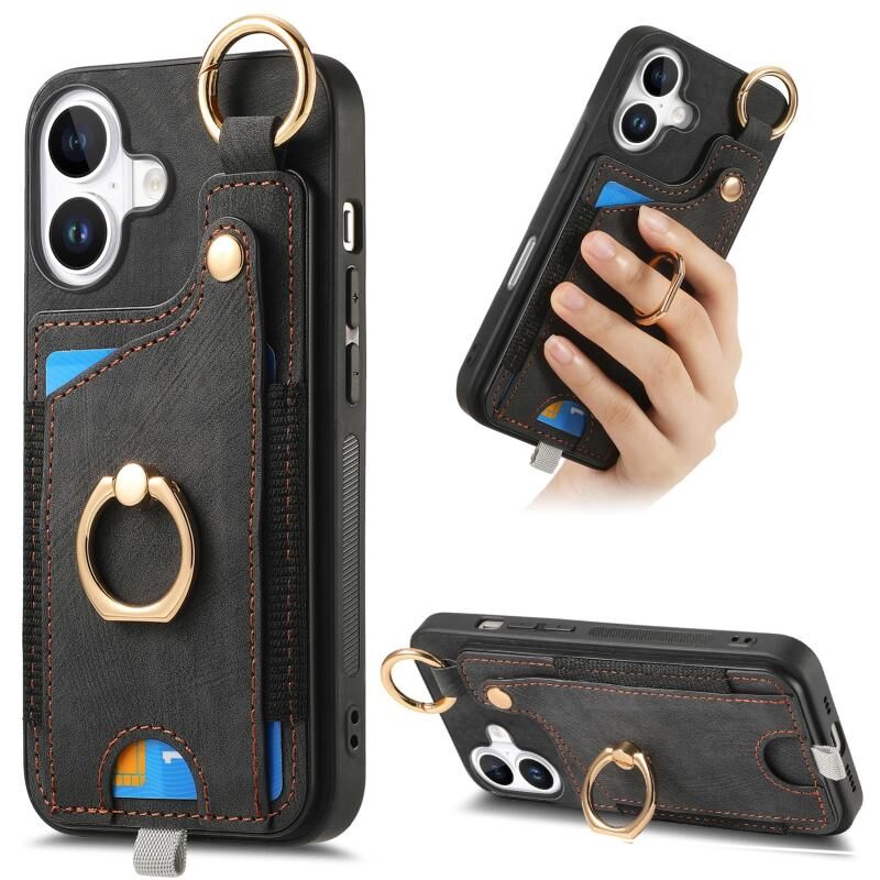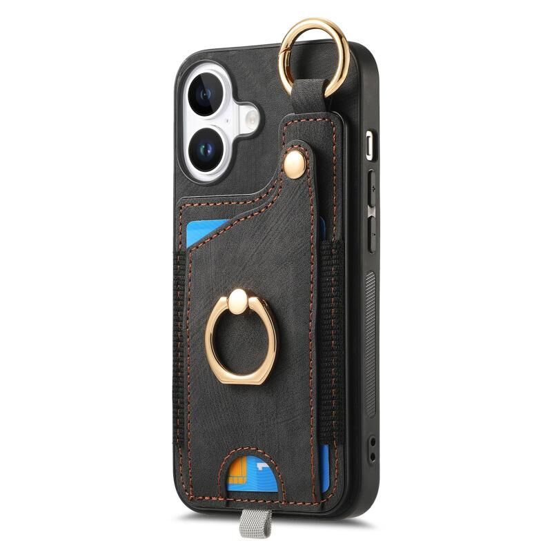 Για το iPhone 16 Ρετρό δέρμα αίσθηση δαχτυλίδι κάρτα τσάντα υπόθεση τηλεφώνου με Hang Loop (Μαύρο)