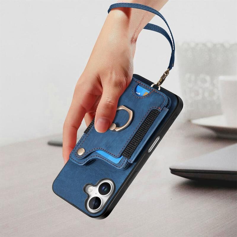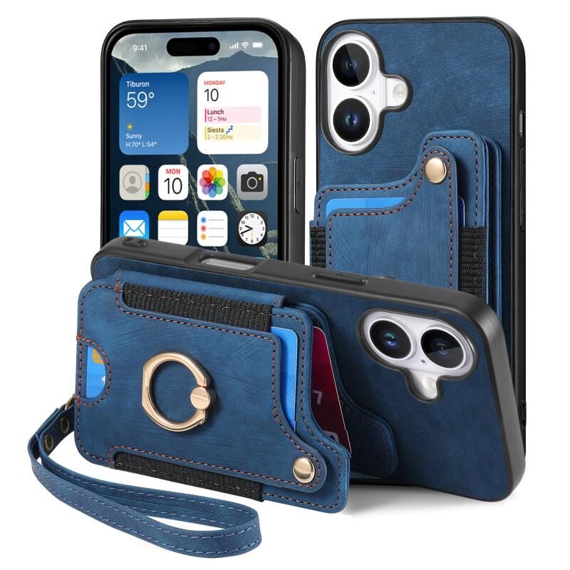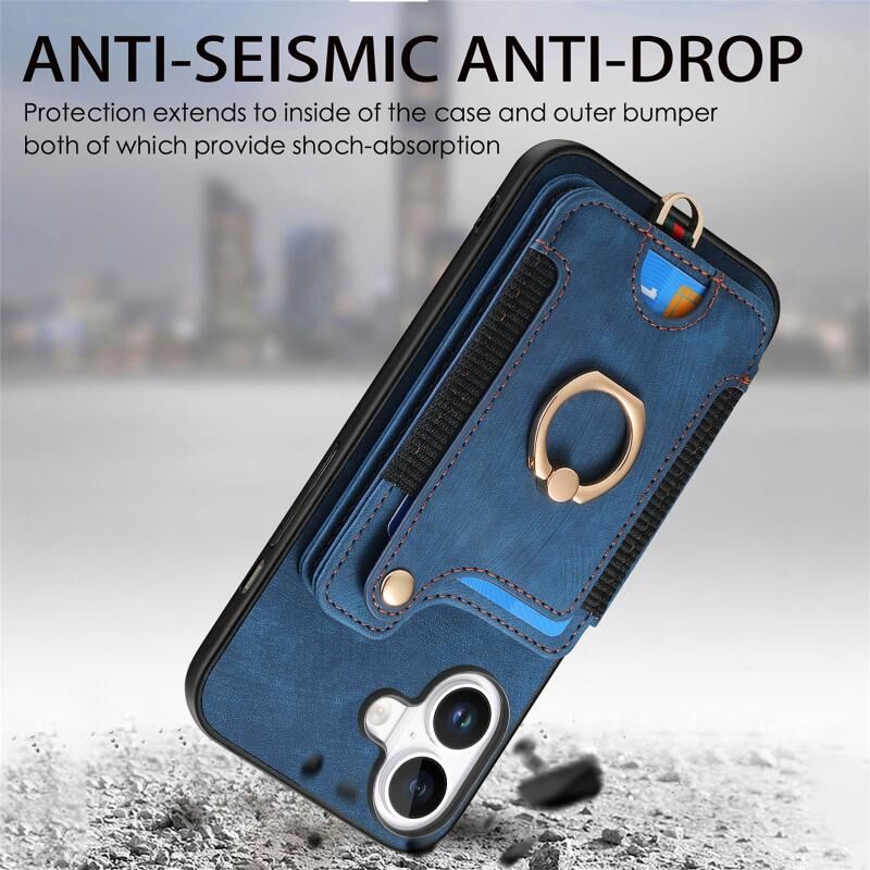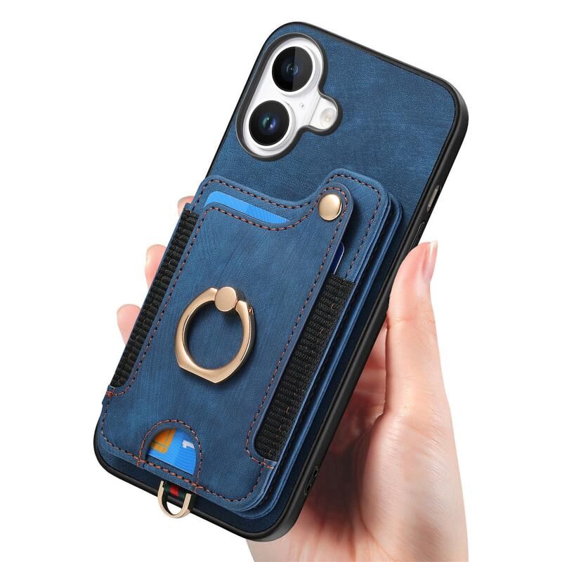 Θήκη τηλεφώνου για iPhone 16 με ρετρό υφή, δακτύλιο και πολλαπλές θήκες καρτών (Ροζ)