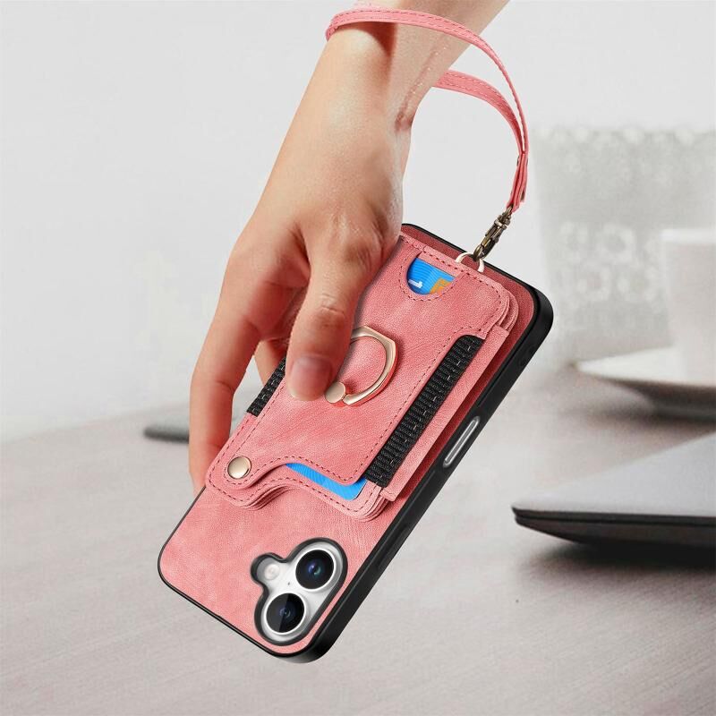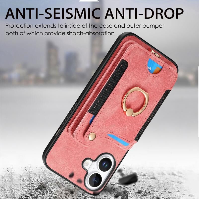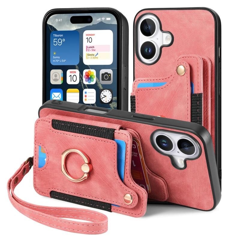 Θήκη τηλεφώνου για iPhone 16 με ρετρό υφή, δακτύλιο και πολλαπλές θήκες καρτών (Ροζ)