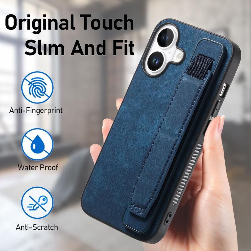 Για iPhone 16 Ρετρό Wristband κάτοχος δέρμα πίσω υπόθεση τηλεφώνου (μπλε)