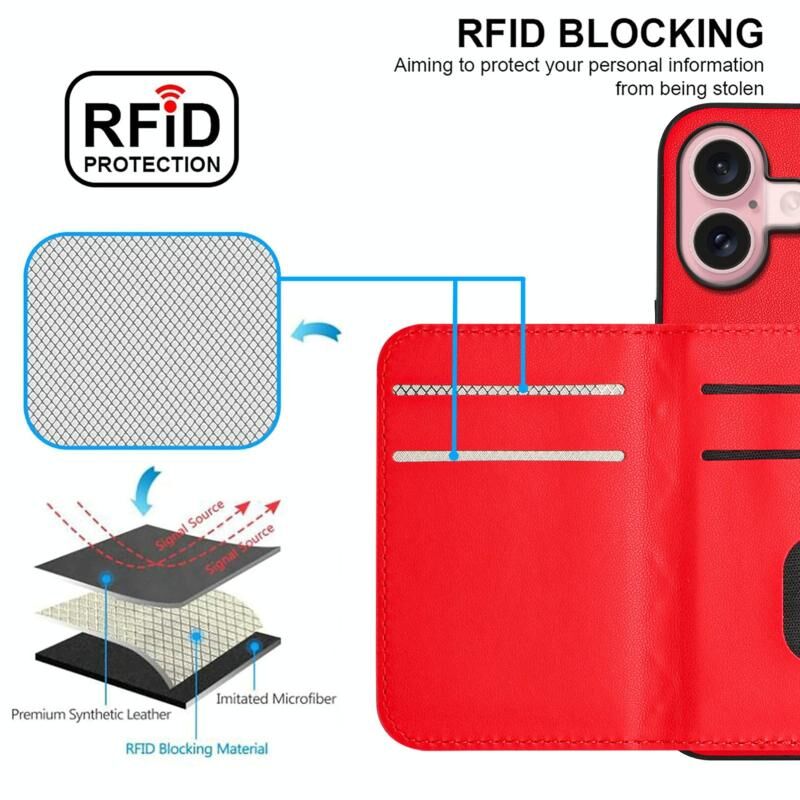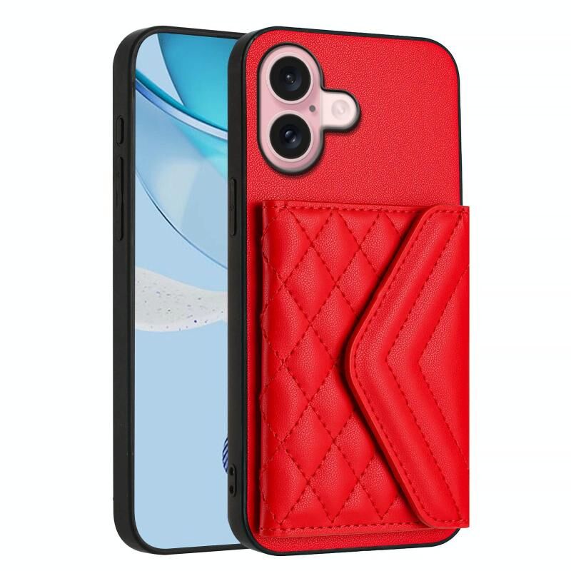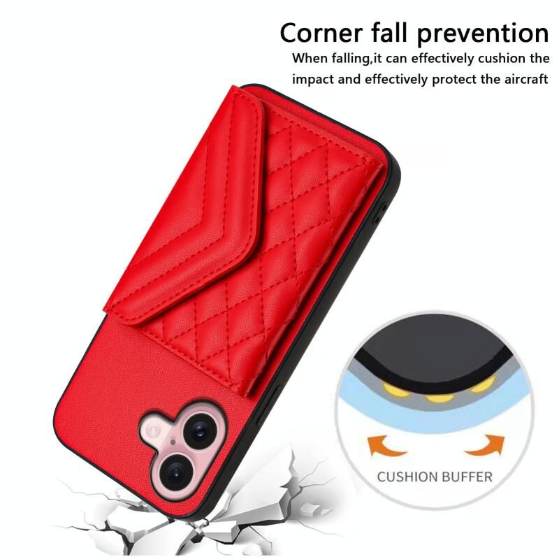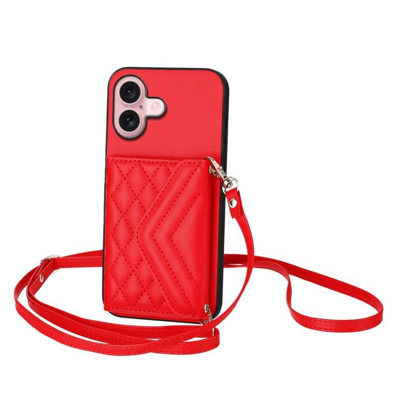 For iPhone 16 Rhombic Texture Card Bag RFID Phone Case with Long Lanyard(Red)