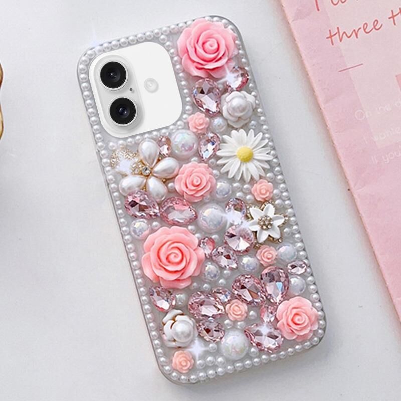 For iPhone 16 Rose Hand-set Diamond PC Phone Case(Pink)