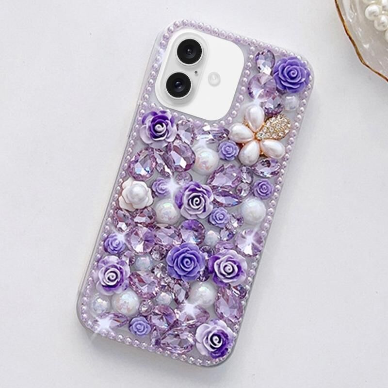 For iPhone 16 Rose Hand-set Diamond PC Phone Case(Purple)