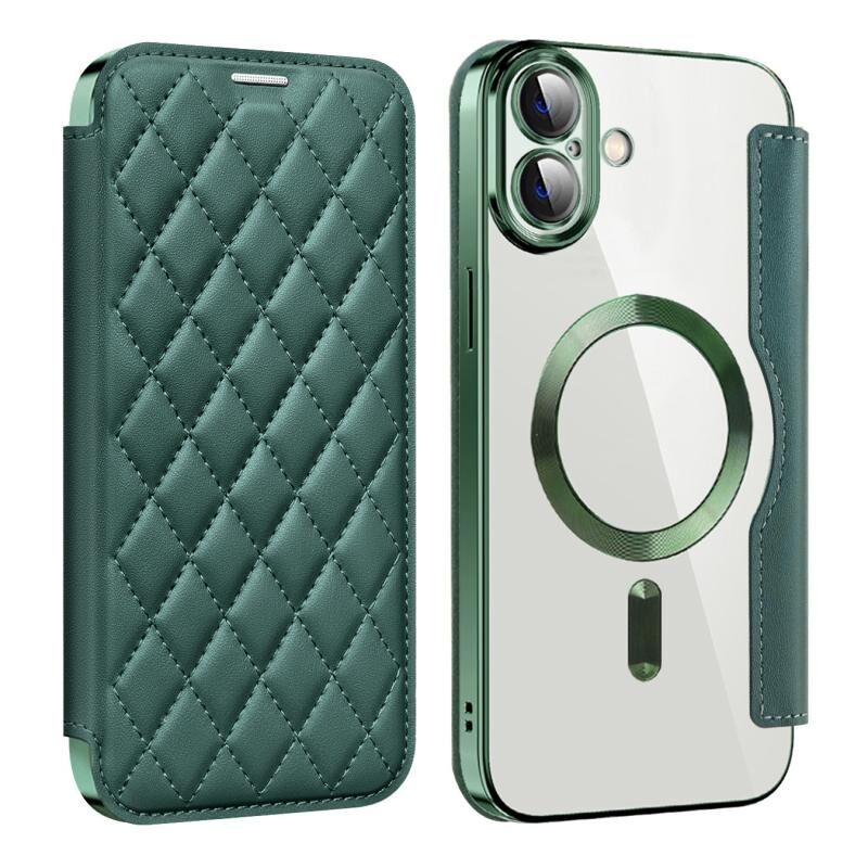 For iPhone 16 Shield Magsafe RFID Anti-theft Rhombus Leather Phone Case(Green)