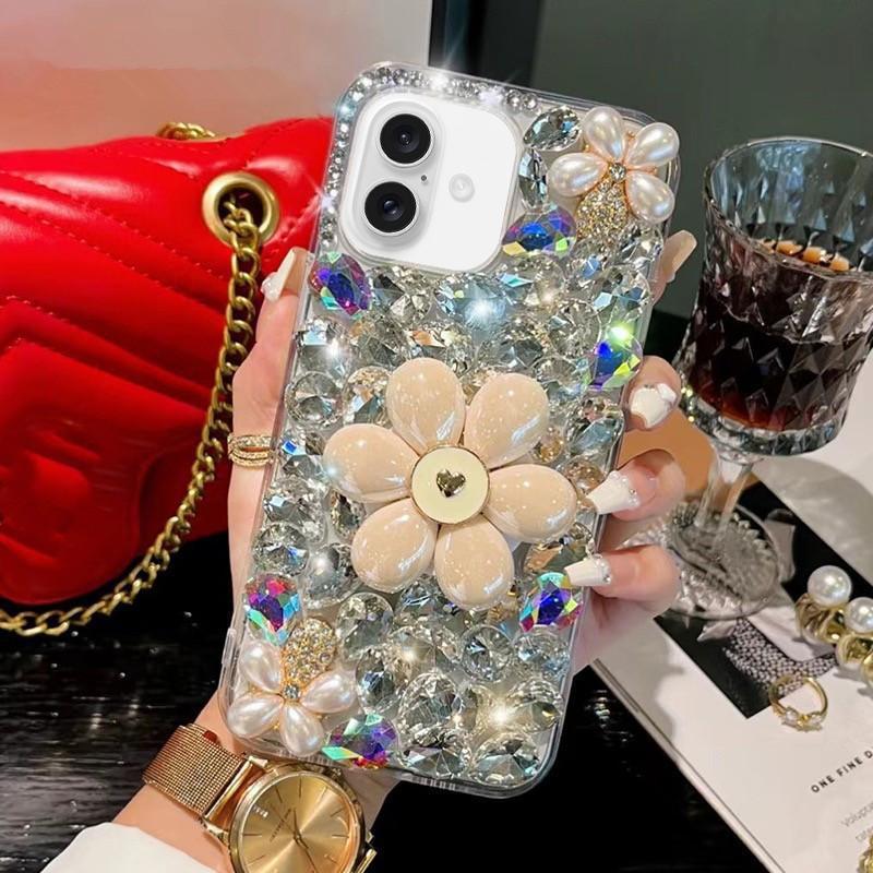 For iPhone 16 Sunflower Holder Hand-set Diamond PC Phone Case(White)