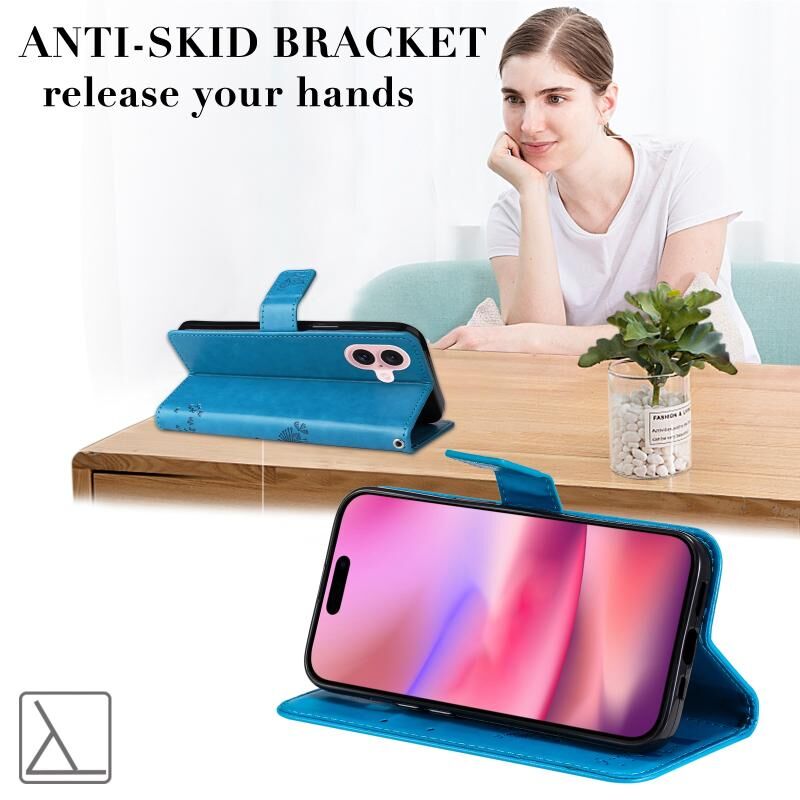 For iPhone 16 Tree & Cat Embossed Pattern Flip Leather Phone Case(Blue)