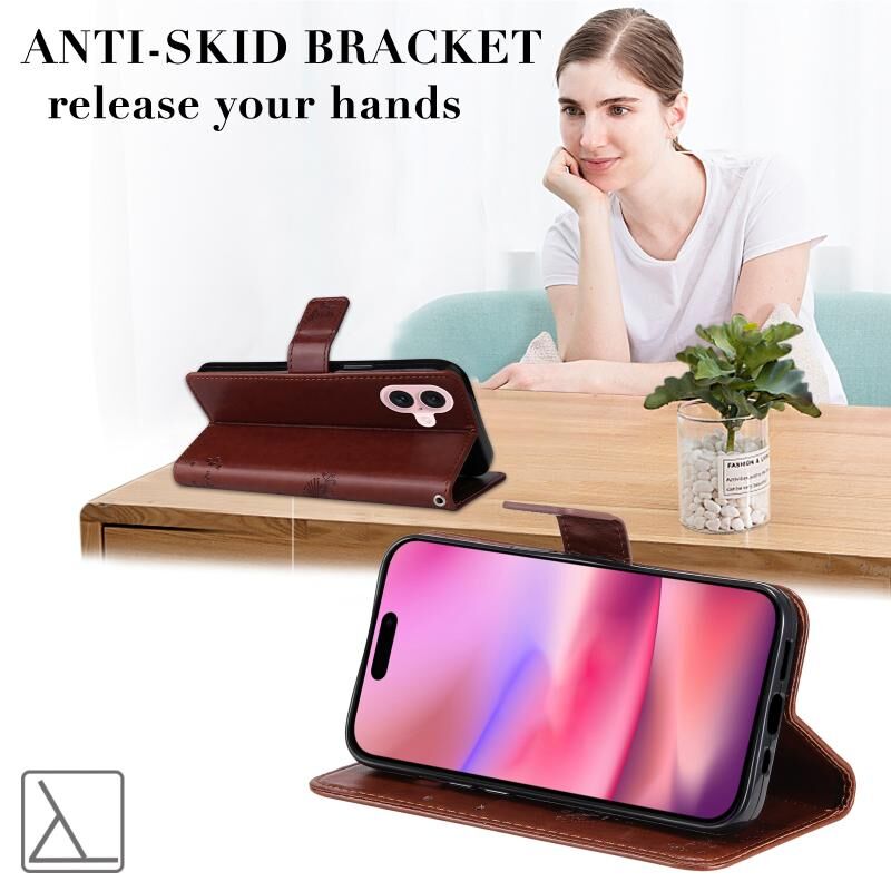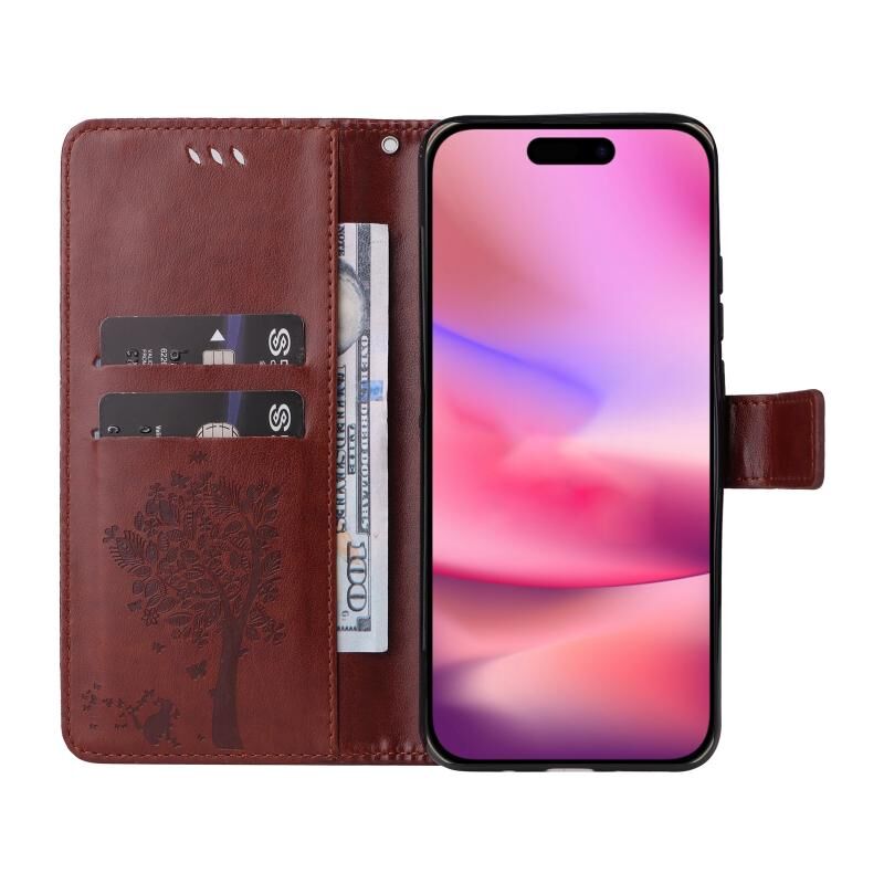 Θήκη τηλεφώνου από δέρμα με σχέδιο ανάγλυφου δέντρου & γάτας για iPhone 16 (Καφέ)