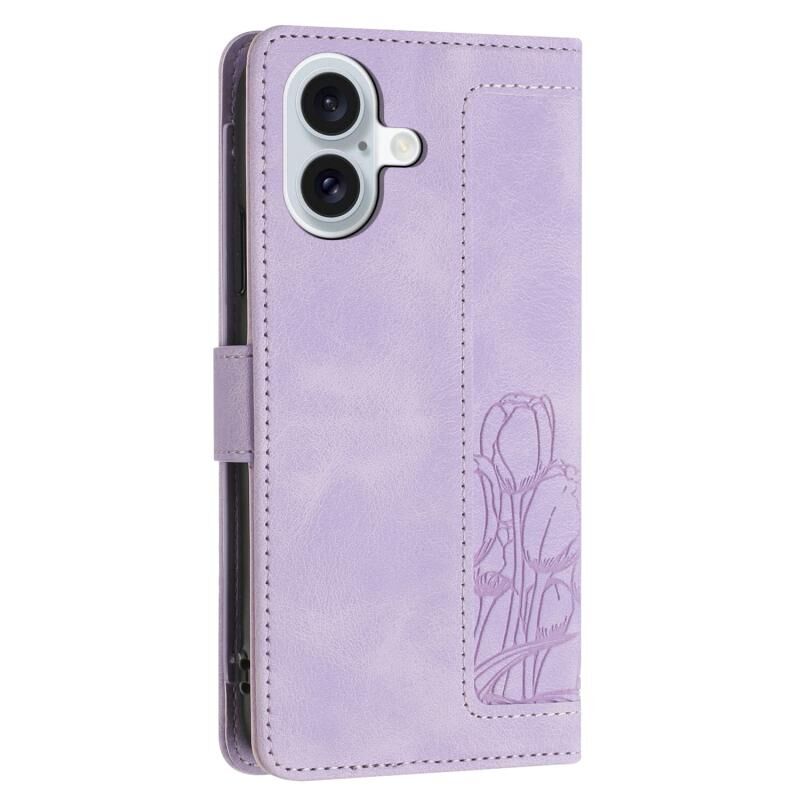 For iPhone 16 Tulips Embossed Leather Phone Case with Lanyard(Purple)