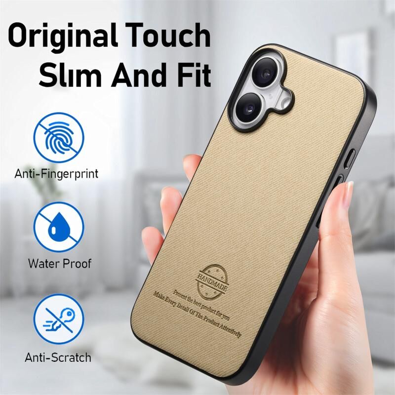 For iPhone 16 Twill Fabric Leather Skin Back Phone Case(Khaki)