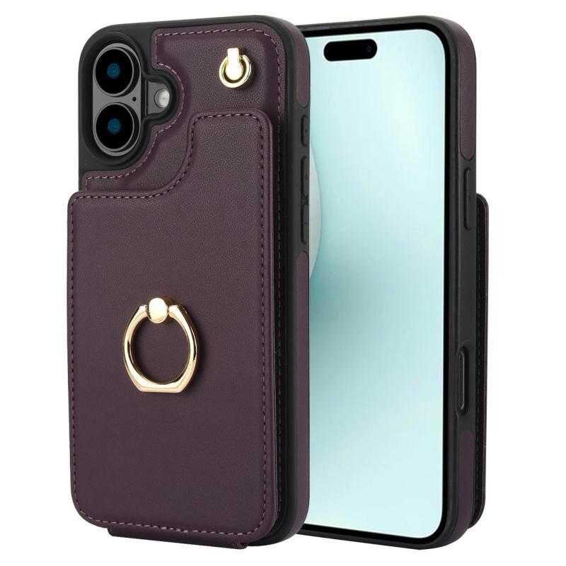 For iPhone 16 YM005 Skin Feel Card Bag Phone Case with Long Lanyard(Dark Purple)