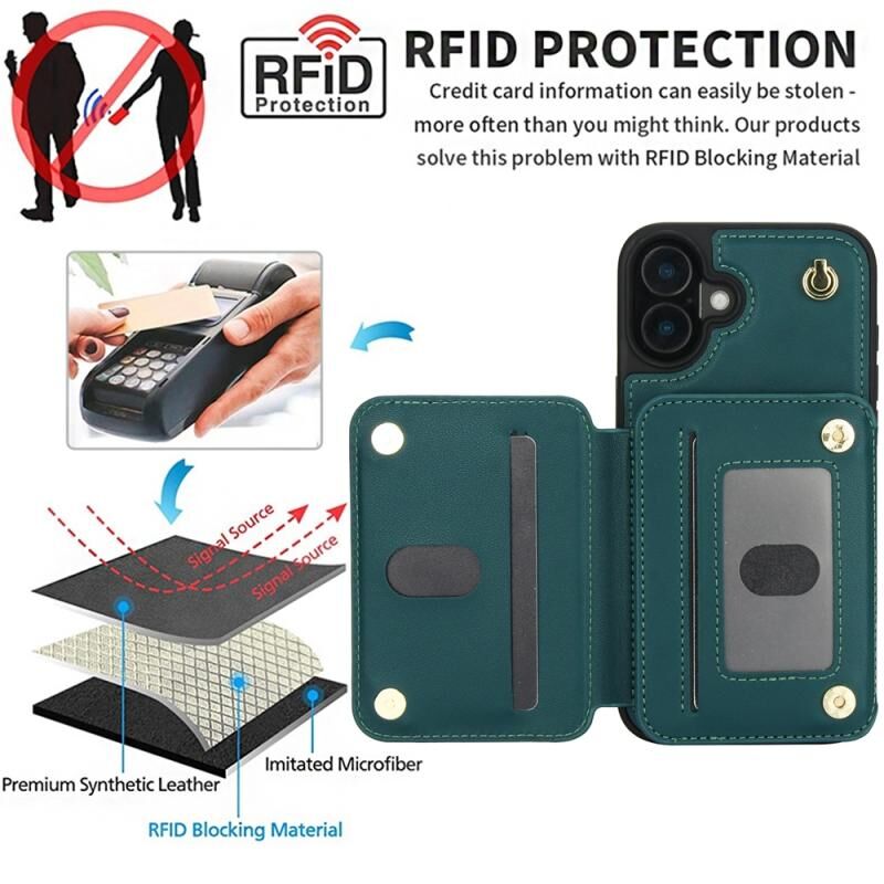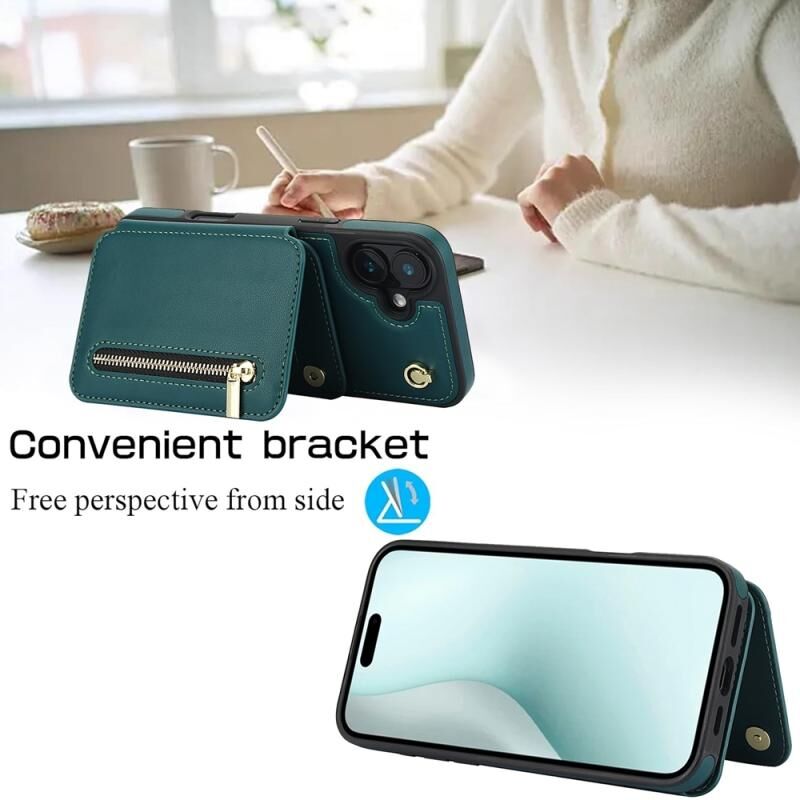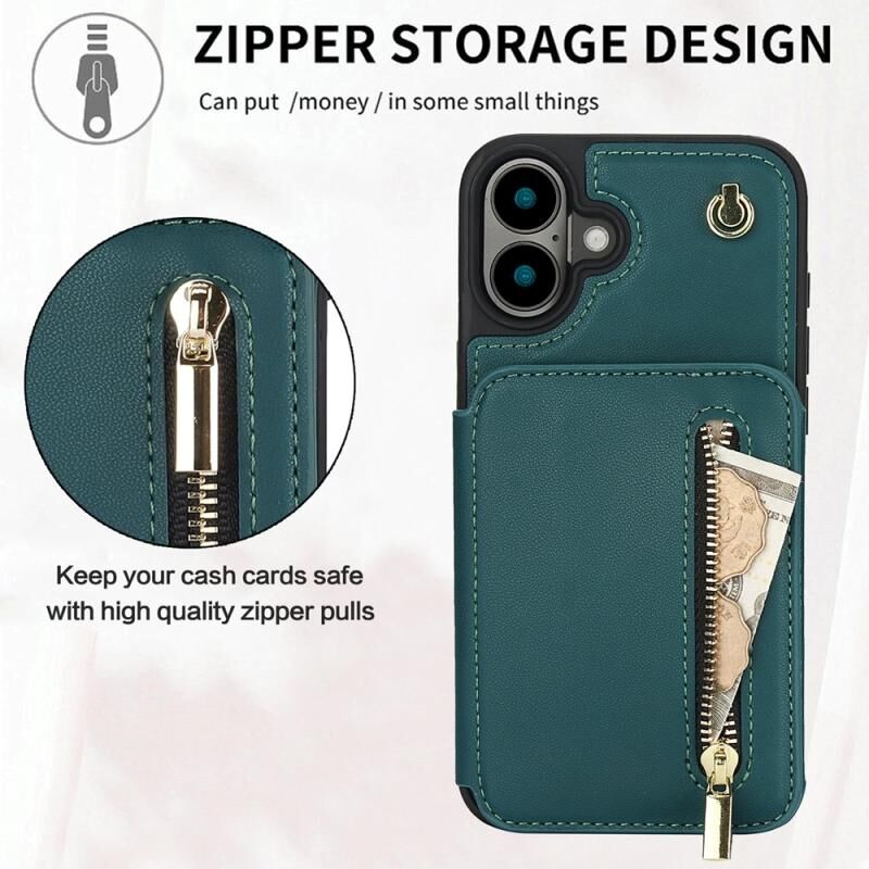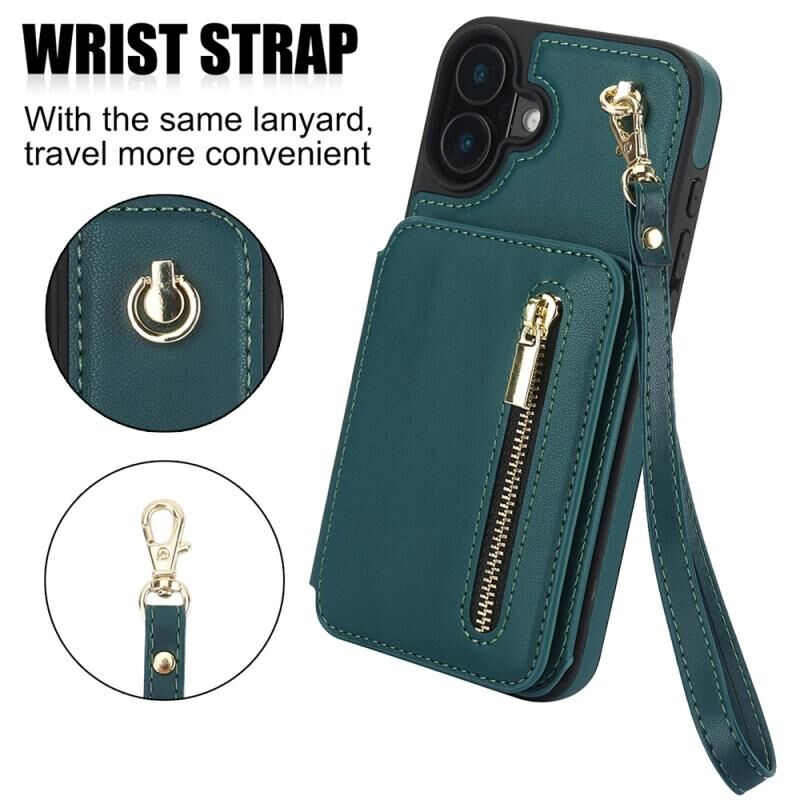 For iPhone 16 YM006 Skin Feel Zipper Card Bag Phone Case with Dual Lanyard(Green)