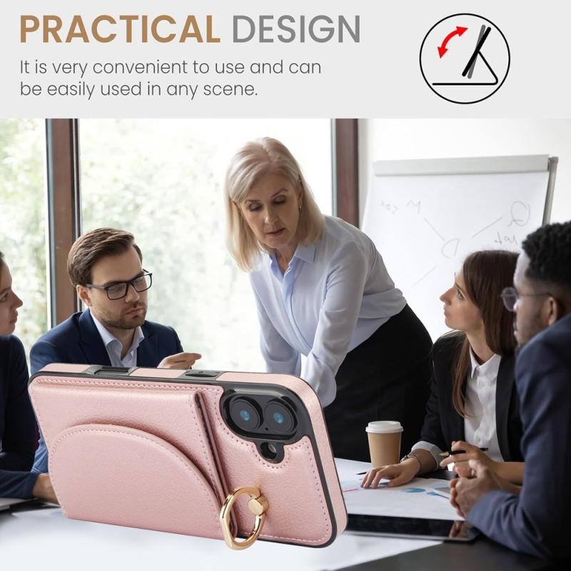 For iPhone 16 YM007 Ring Holder Card Bag Skin Feel Phone Case(Rose Gold)
